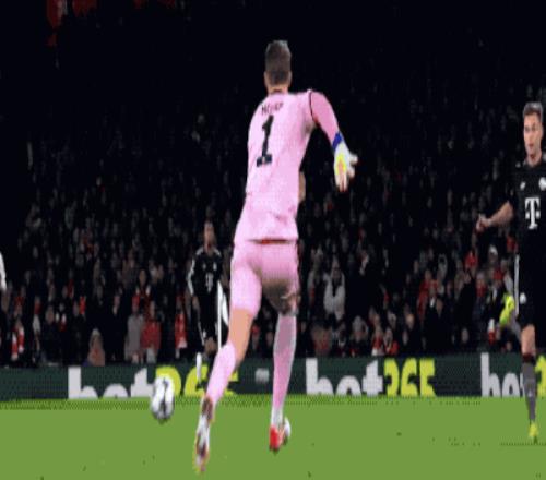 第9分钟,诺伊尔的传球直接被萨利巴截断,但萨利巴展现了后卫的脚法,又把球传了回去。