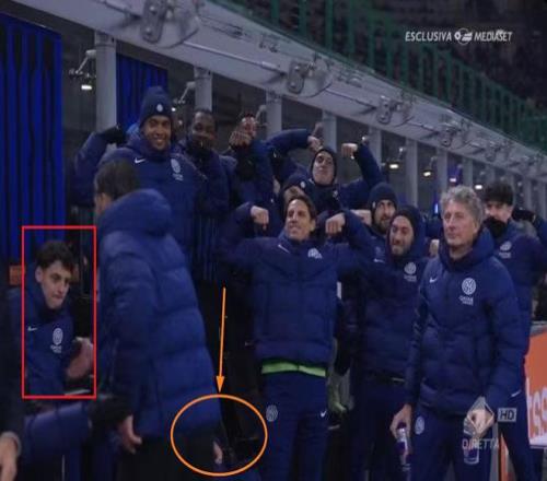 事情是这样的,如下图中黄色圆圈标记出的位置;在皮奥-埃斯波西托被替换下场时,直播镜头捕捉到了国米替补席这样的一个有趣的一幕,大家都站起来模仿皮奥庆祝进球的动作,以表达对他的鼓励、喜爱亦或者是调侃。但这里面唯独少了一个人,谁呢?没错,狗哥特意为此会看了一遍比赛录像,一帧一帧的看,发现这个位置坐着的人,正是劳塔罗。