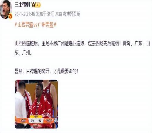 北京媒体人三土带刺老师则表示:山西四连胜后,主场不敌广州遭遇四连败,过去四场先后输给:青岛、广东、山东、广州。显然,古德温的离开,才是最要命的!